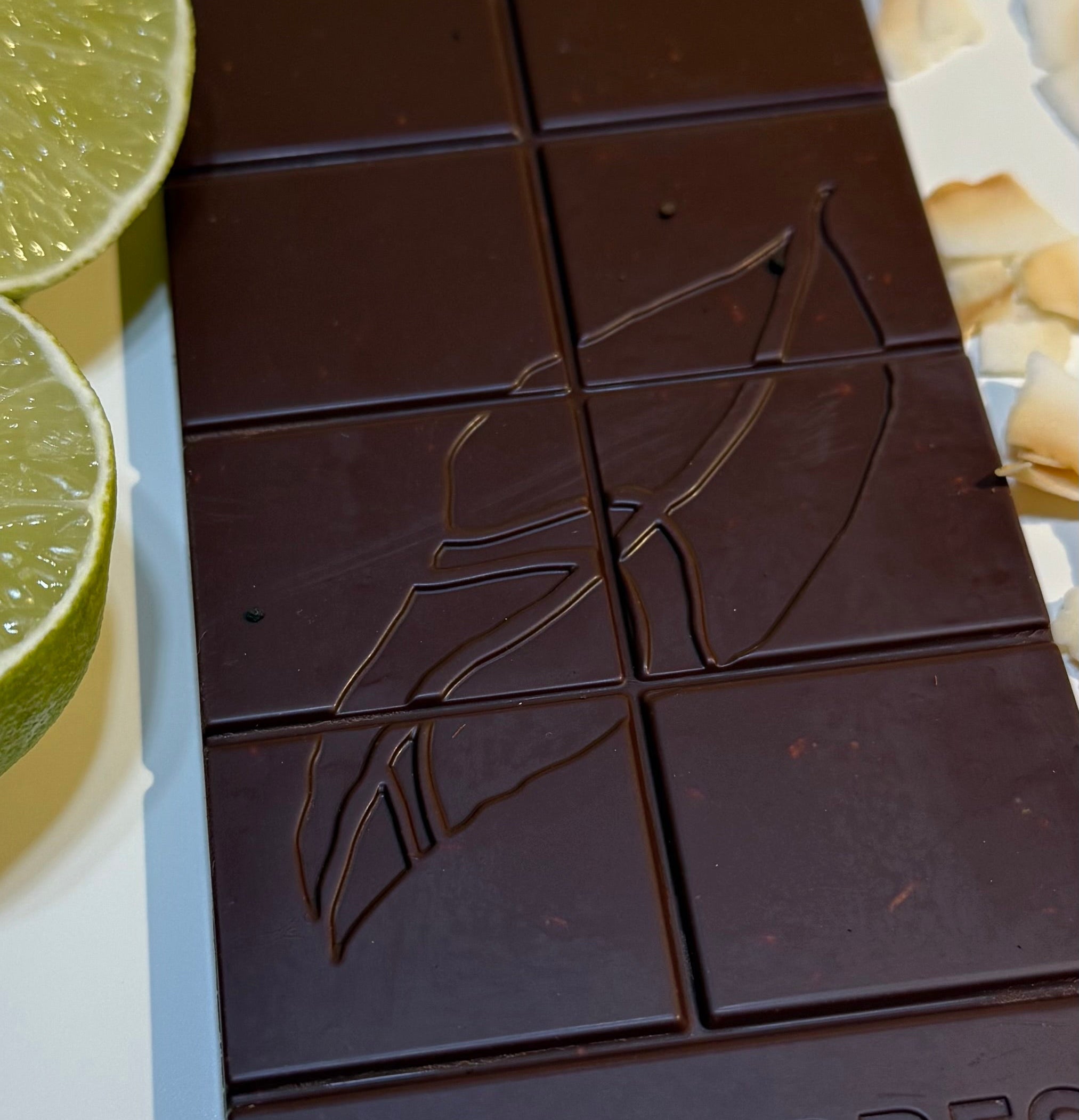 A taste of summer with 65% coconut milk chocolate laced with bits of crunchy toasted coconut and fresh lime peel, topped with a light sprinkling of black lime. This bar is modelled after our refreshing chocolate-dipped coconut lime popsicle which we offer at markets in the summer. Now we don’t need to say goodbye to that delicious combination of flavours.